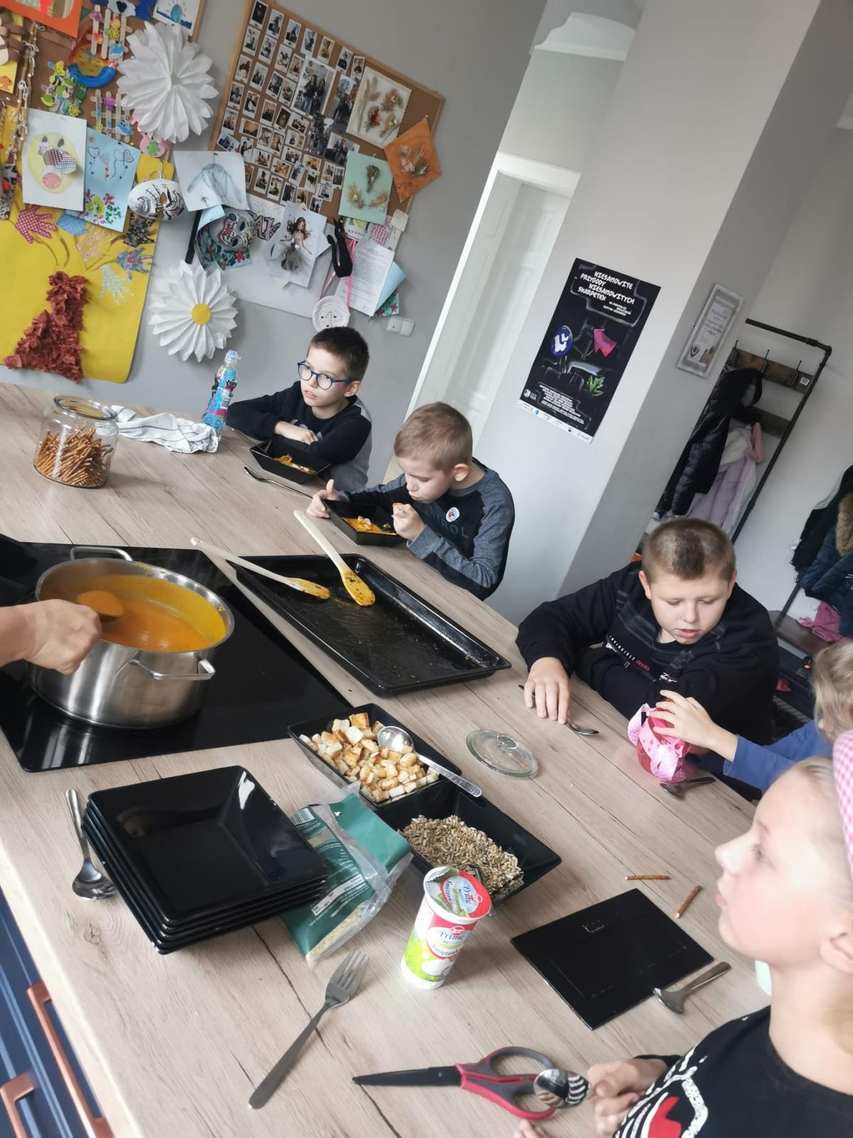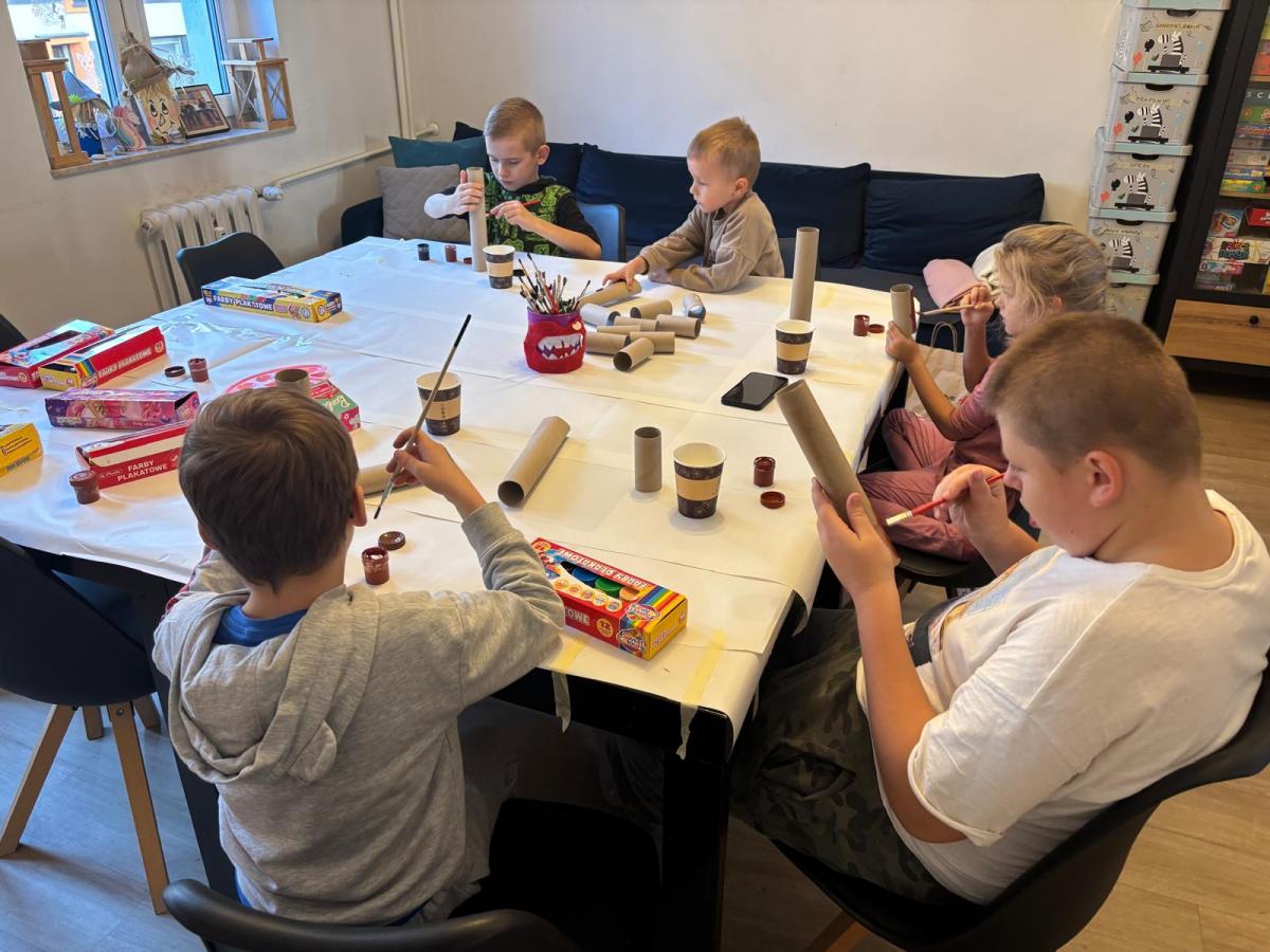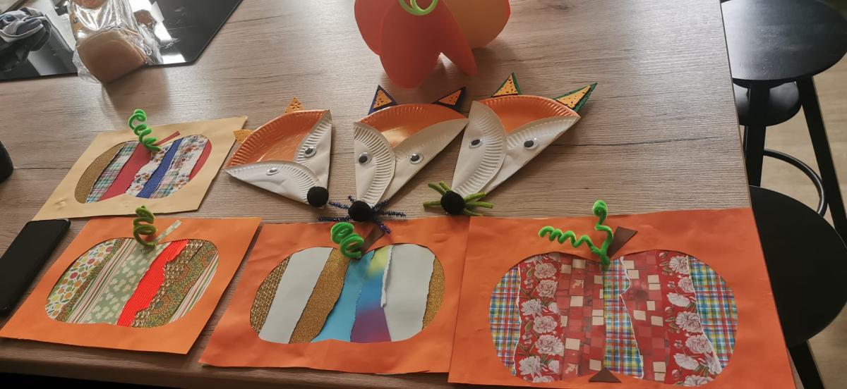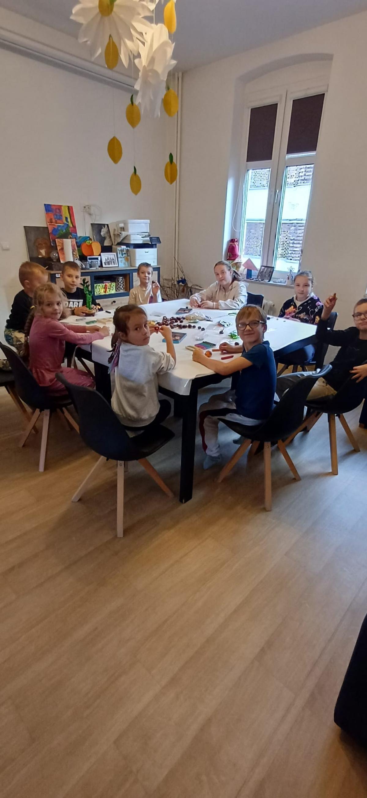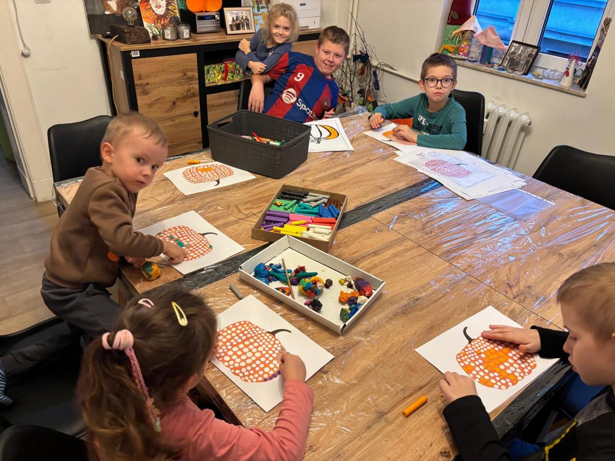 W październiku 2025 r. w Pracowni Samodzielności „Zakątek” zrealizowano cykl dziewięciu zajęć plastyczno-kulinarnych. Podczas spotkań dzieci wykonywały laurki, tworzyły obrazy z suchych liści, wykonywały prace plastyczne i kulinarne z dynią, przygotowywały figurki z kasztanów, piekły ciasta, przygotowywały hamburgery oraz uczestniczyły w warsztatach tematycznych związanych z Halloween.