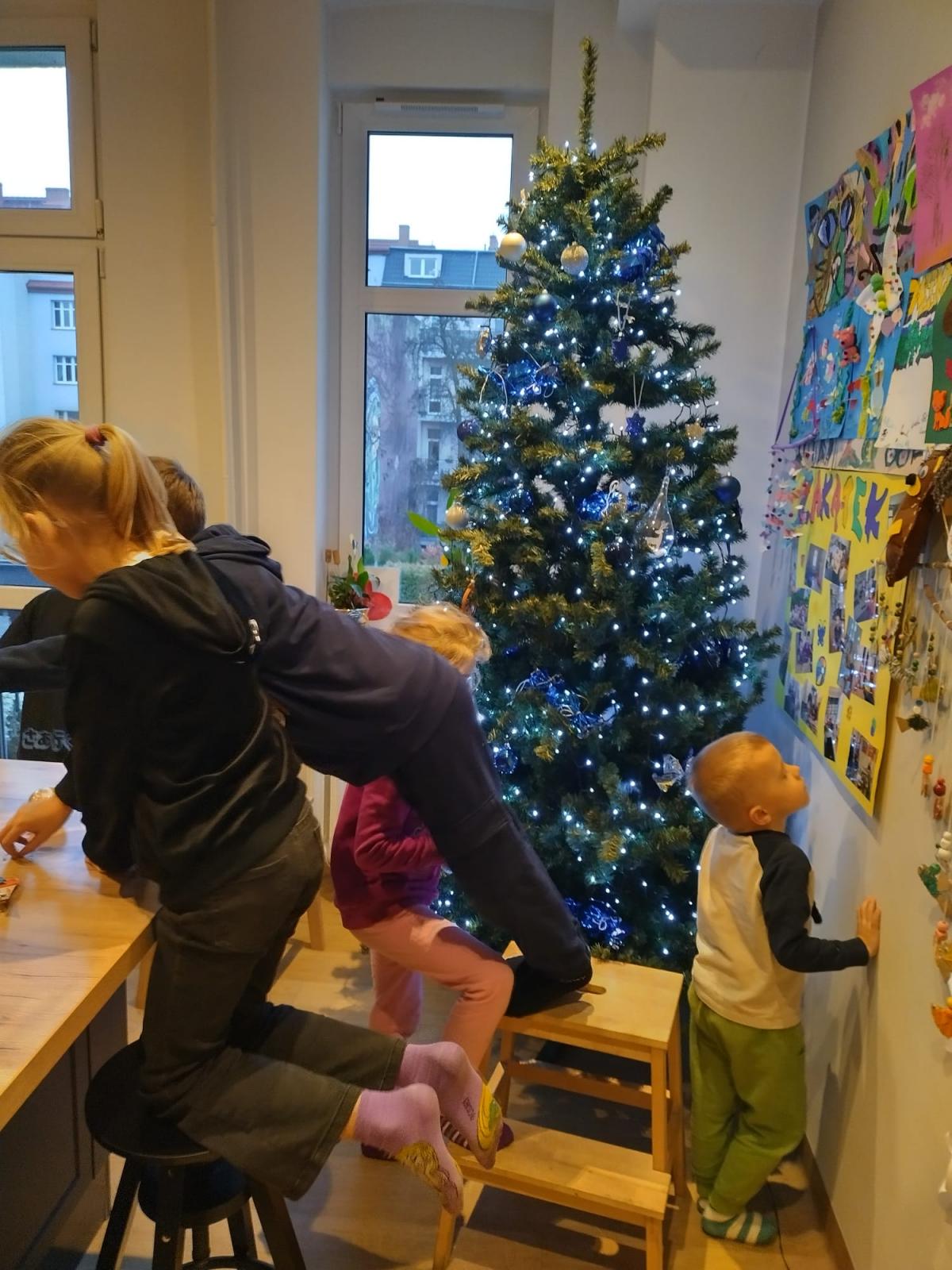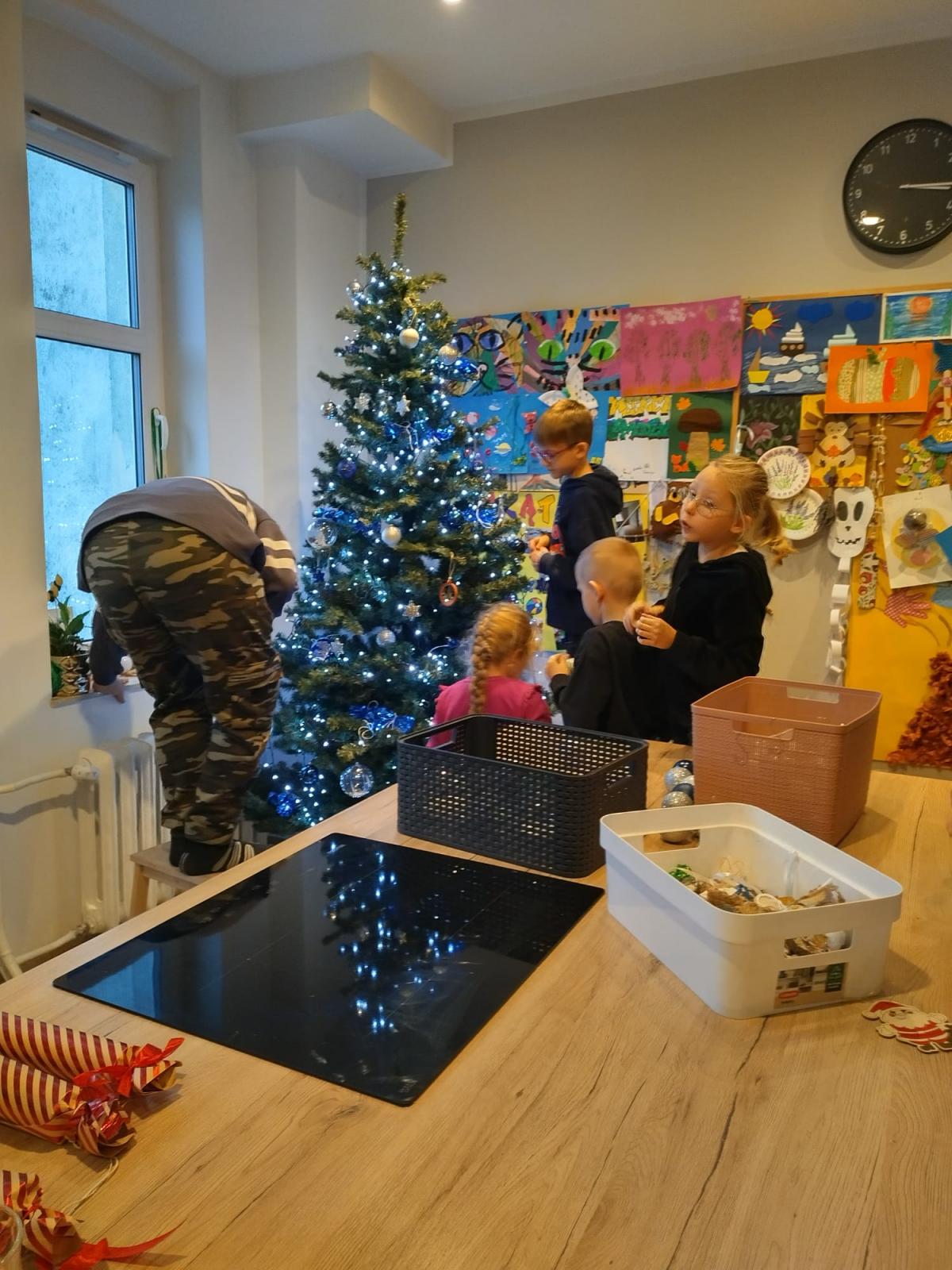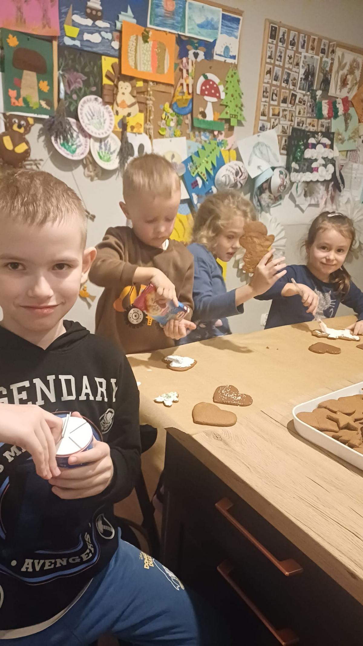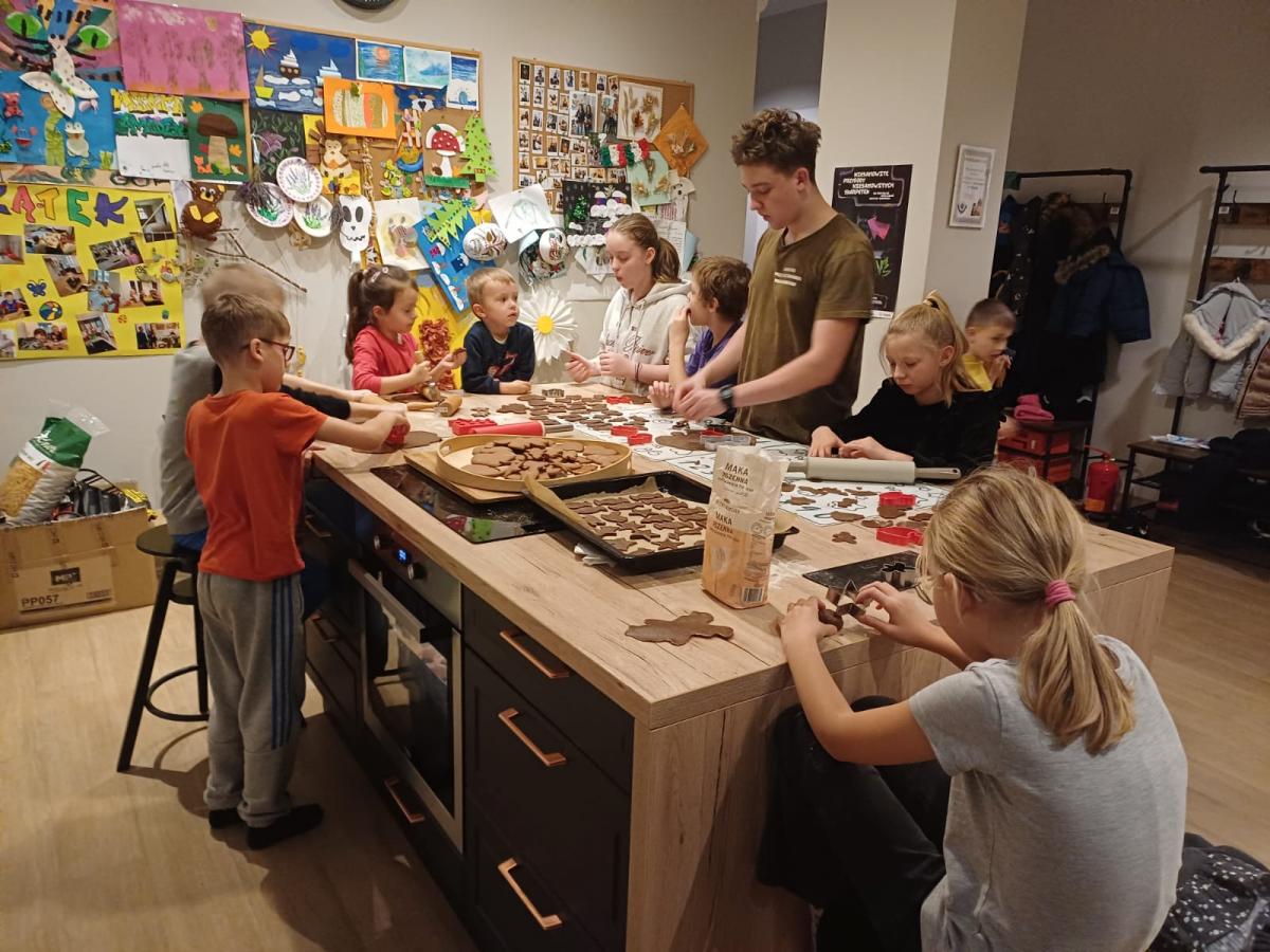 Podczas grudniowych spotkań dzieci z entuzjazmem piekły i zdobiły pierniki, tworząc kolorowe, pachnące dzieła sztuki. Nie zabrakło również zajęć plastycznych – powstawały świąteczne stroiki, ozdoby choinkowe, kartki bożonarodzeniowe oraz nastrojowe lampiony. Wspólne ubieranie choinki stało się okazją do rozmów, śmiechu i dzielenia się świątecznymi tradycjami. Zajęcia kulinarne pozwoliły dzieciom poznać podstawy pracy w kuchni, a także czerpać radość z przygotowywania prostych, świątecznych smakołyków.