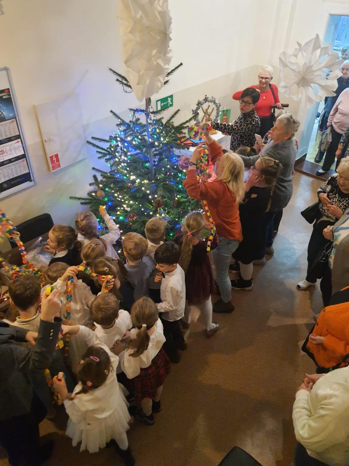 Grupa przedszkolaków zaprezentowała piękne kolędy, po czym przystąpiliśmy do wspólnego dekorowania naszej choinki własnoręcznie wykonanymi przez dzieci ozdobami, które dodały wesołego rodzinnego charakteru naszemu drzewku. Przedszkole brało również czynny udział w zbiórce darów do paczek dla naszych podopiecznych, które tego dnia zostały nam oficjalnie przekazane. W ramach wdzięczności dzieci zostały nagrodzone wielkimi brawami, bezgraniczną wdzięcznością i słodkim upominkiem od naszych seniorów. Takie spotkania, zwłaszcza w okresie przedświątecznym rozpalają serca i wnoszą szereg pozytywnych emocji.